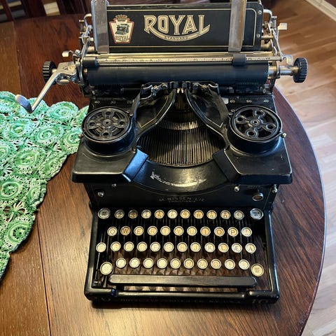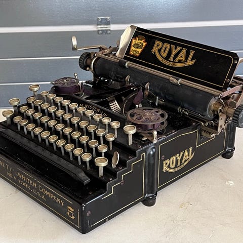 Dette er en: Sceidegger International 5000, Italiener. Trenger nok en service og smörning, må vel justeres litt også samt blekkbandet har jo selvfølgelig tørket ut etter at den har stått i årevis, vet ikke tilgangen på disse blekkbandene. Selges slik den står. Jeg lar den gå for 350,- + frakt ved sending.