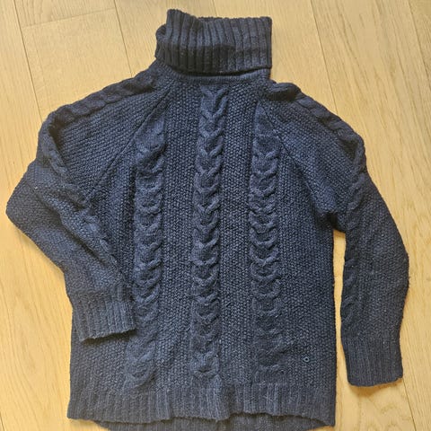 Deilig tykk håndstrikket ullgenser strikket i godt ullgarn. Lite og svært pent brukt. Er en unisex modell og passer dame M/L eller herre S/M. Høy hals. Strikket på 70tallet og lagt lagret siden