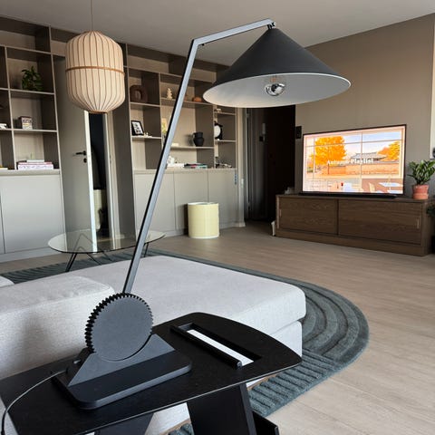 Oi soi oi grå lampeskjerm i silke. Aldri brukt, bare vært på lager. Høyde 39 cm, diameter 40 cm.