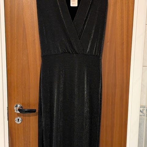 Fin kjole med v hals. Det er gull farge på den rundt hals åpning.
