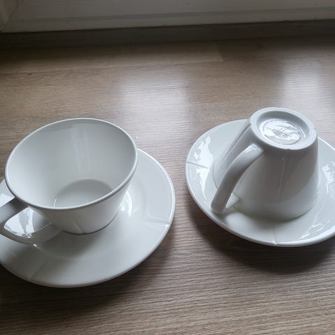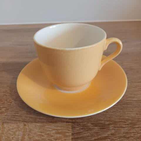 4 kopper med tefat, koppene lys gule, tefat litt mørkere gul, Tupperware (plast). Selges samlet kr 80,-.