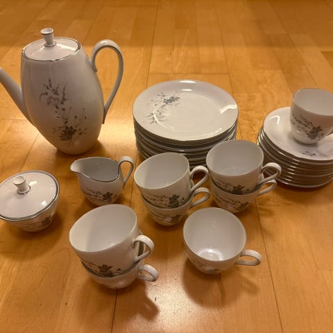 Består av 5 kopper med skåler, med tilhørende asjetter, en liten bolle, samt tekanne med skål til å ha under. Den ytterste delen på tuten på tekannen er borte, men det vises ikke så godt. Den heller ikke skjevt.