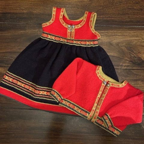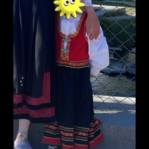 Vestfold bunad til jente 4 - 6 (kan brukes før og lengre ut i fra lengden til barnet). Min datter brukte den når hun var 4 til hun var 7 (den var veldig kort når hun var 7).