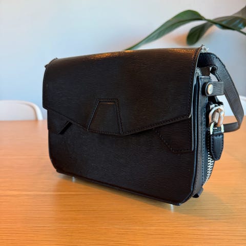 Skinnet har røket litt på håndtaket - se bilde. Vesken selges derfor billig.