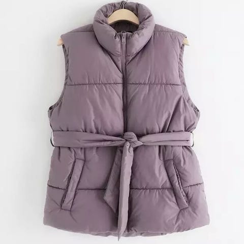 Kort, vattert vest med høy krage, trykk-knapper og lommer foran. Fôret.