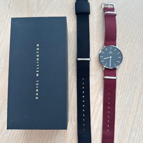 Classy Daniel Wellington klokke med svart leather strap. Kommer med original esken. Trengs ny batteri.