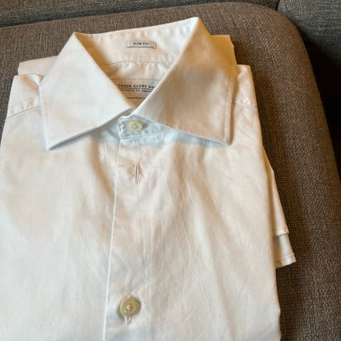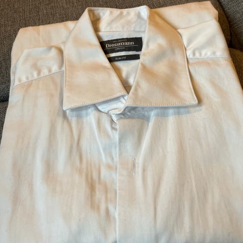 Pen hvit skjorte fra Acuascutum of London. Tror det er en snoking skjorte, oppbrettede ermer til mansjettknapper og ribber på brystet. Kan sendes