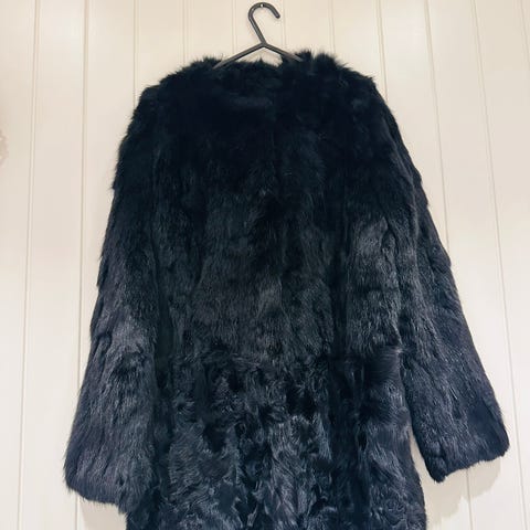 Målt over brystet er kjolen 41 cm (men stoffet er strikket, så passer fint meg som er 92 cm rundt), når den ligger flatt, og lengden er ca 89 cm (målt fra halsringing bak til skjørtekant, se bilde)