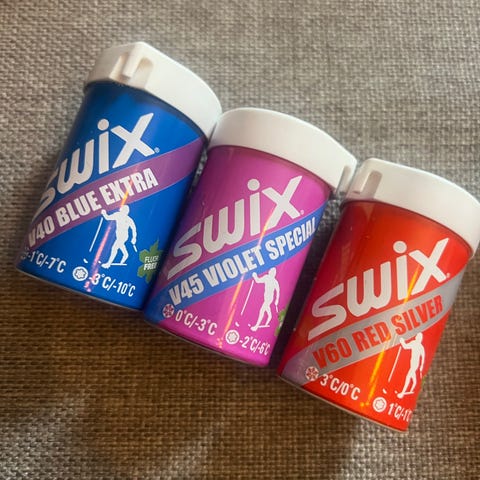 Vi har alt for mye skismørning og har nå ryddet opp litt. Selger en veske med 5 Swix smørninger til forskjellige temperaturforhold og en skrape. Alt er ubrukt.