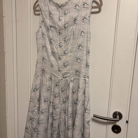 Elegant, vakker og behagelig kjole fra Inwear i 100% silke. Kjolen har et nydelig mønster, vakre farger og et veldig fint snitt. Kjolen er pent brukt, men har bittelitt misfarging i fôret og selges derfor rimelig. Se bilder. Den har v-utringning, korte ermer, vidt skjørt, pent knytebånd/belte i midjen (avtagbart) og glidelås i siden. Svært anvendelig - kan pyntes opp/ned til ulik bruk.
