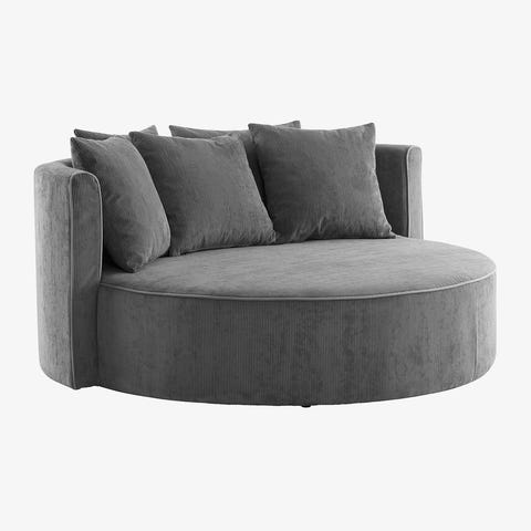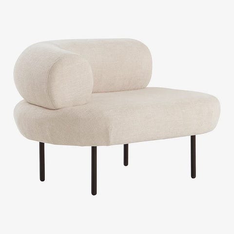 De har et helkledd trekk i hvitt teddystoff med en avrundet rygg, sylinderformet sete og to puter.
