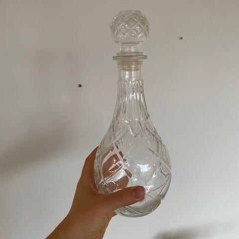 Pen karaffel og 8 glass (pulverglass). Karaffelen har høyde 18 cm, glassene har høyde 5,5 cm. Selges samlet for 350,-