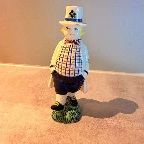 Figur av golfspiller laget av Rolf Berg. Den er 19 cm. høy. Det har vært en liten skade på hatten som er reparert og overmalt. Derfor den lave prisen.