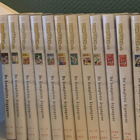 Eg selger 37 bøker av Donald Duck - de komplette årganger samlet for kr 3500,- eller høgeste bud. Kjøper betaler porto. Det kan hentes/muligens leveres.