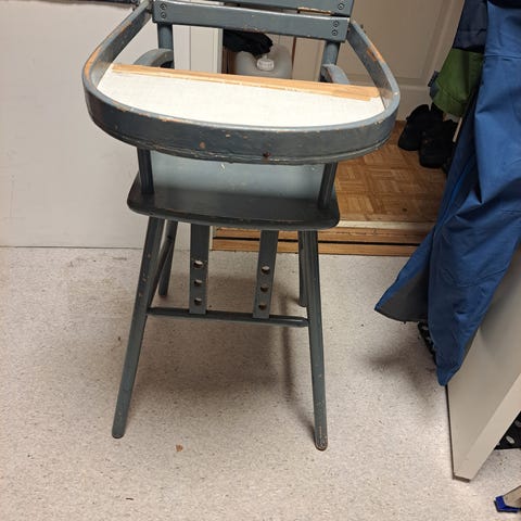 Fin, ant. 1970 talls barnestol m/blått stoff og buet rygg
