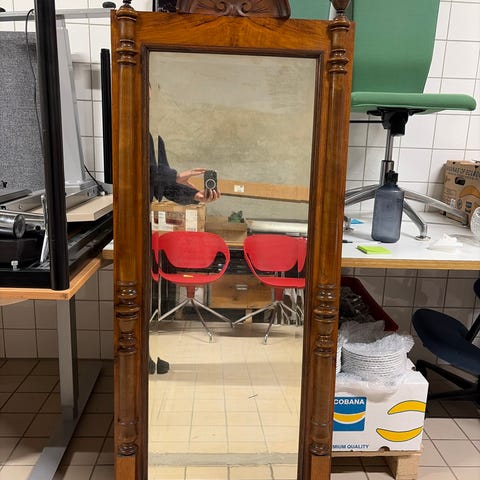Gammelt speil med nydelige utskjæringer. Usikker på hvor gammelt, men ble funnet på loftet på et gammelt hus jeg leide.