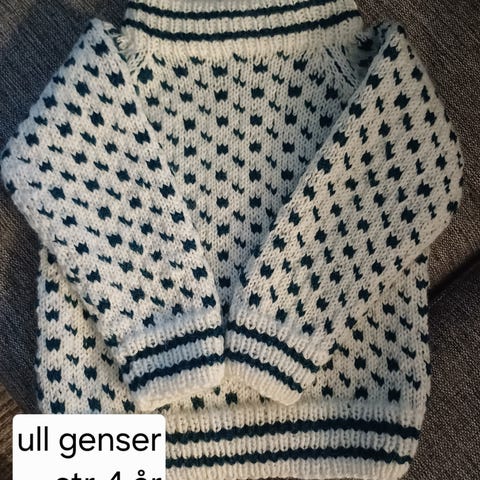 To ullgenser som nesten ikke er brukt. De er strikka i Alafosslopi. Usikker på str så har lagt med mål på bildet. Ta kontakt om spørsmål. Pris står på bildene.