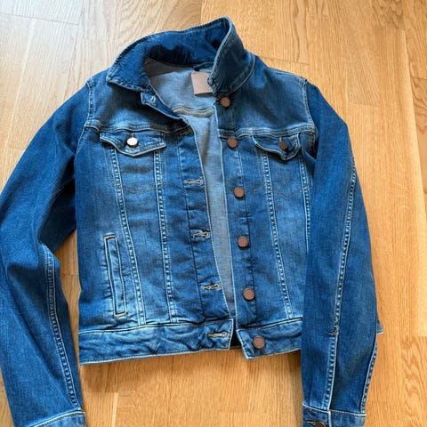 Jeansjakke str. 36 fra H&M, nesten ny, ingen feil/skader, fin blå klasisk farge.