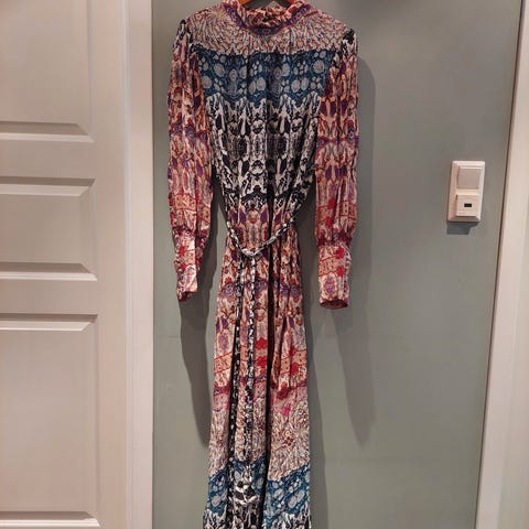 Lang ,smal kjole i satenglignende stoff. Behagelig på