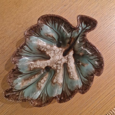 Denne skatten er fra merket Sarreguemines, og heter Green Cabbage Leaf Platter. Markeringene tyder på at skålen ble laget så tidlig som på 1930-1940-årene.