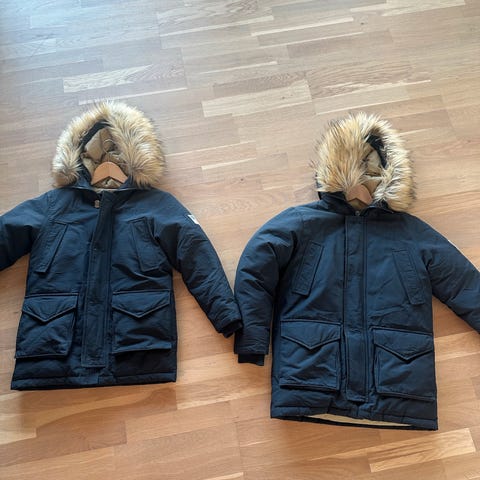 Meget pent brukt SVEA jakke selges. Ingen skader eller synlig slitasje. Mørkeblå med beige fôr og pels på hetten. Hetten er avtagbar.