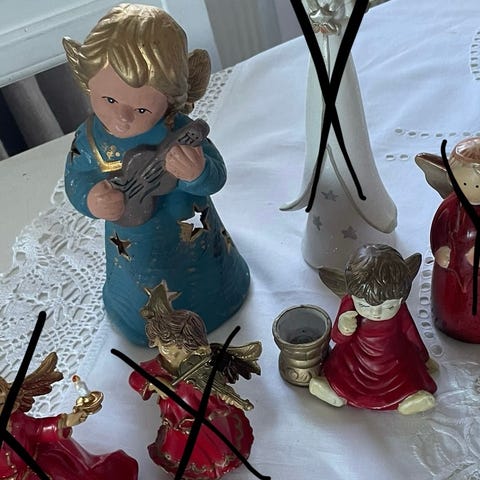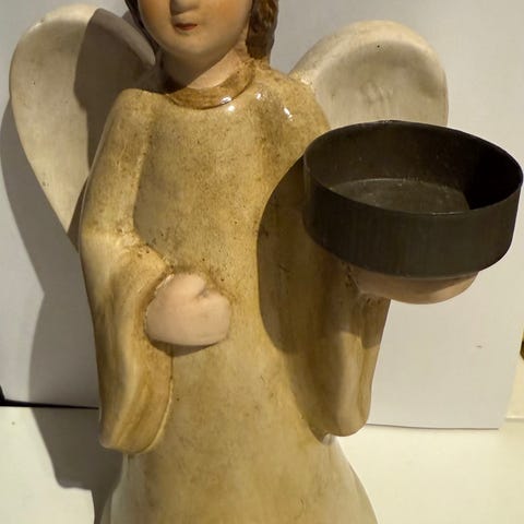Skjønn keramikk gull hvit engel med lysestake til vanlig stearinlys fra Jessica Design Collection. L 12 cm. Kr 75.