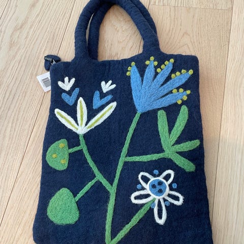 Strikkede totebags/vesker i tykt ull segles grunnet lite bruk. Fôret på innsiden med en liten lomme. Selges samlet