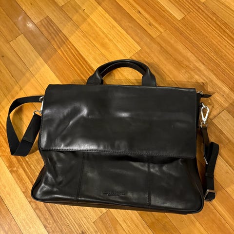 Dyp blå lærtaske med skulderrem, feks. PC, bøker etc..