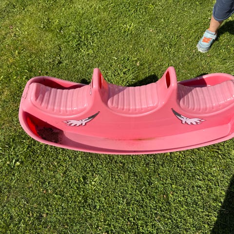 Selger pent brukt vippe til barn. Kan festes fast med medfølgende festespyd til gressplen.