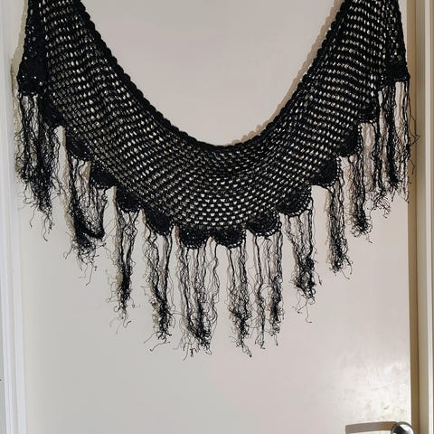 Stort sjal. Lengde 155 cm. Kortsiden er ca 110 cm. 65% ull/35% bomull. Kr. 500,- + porto