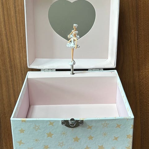Lite smykkeskrin med ballerina som danser når det trekkes opp. Fin melodi. Lite speil og skuff. Har et merke foran etter at den lå ved siden av er fuktig håndkle.