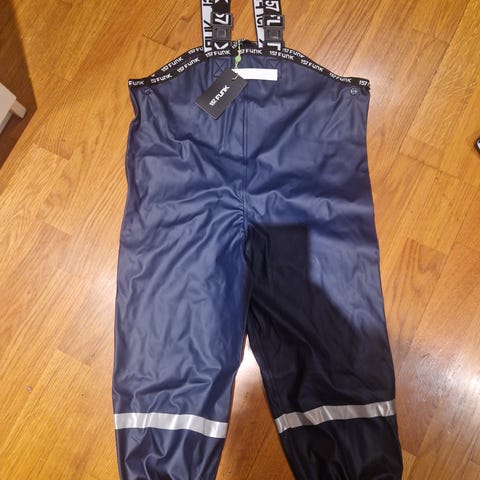Vill regnbukse med seler str 2-3 år. Med strikk nederst og reflekser. Finner ingen anmerkninger.