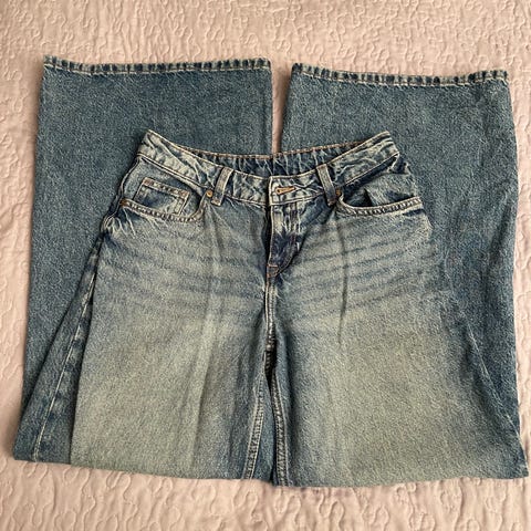 H&M jeans i blå farge, størrelse 34 for kvinner. Midjemål er W25. Passer til hverdagsbruk og gir en stilren look.