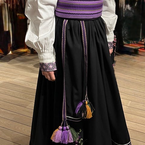 Ta kontakt for nærmere mål. Kan prøves i Fredrikstad. Selges komplet med belte, forklebånd, skjorte i kryssbroderi og stakk. .Passer ca.36/38 str. og høyde fra 160 cm