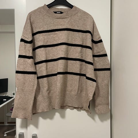 Deilig strikket genser, oversized, marineblå og beige/brun. Splitt i sidene.
