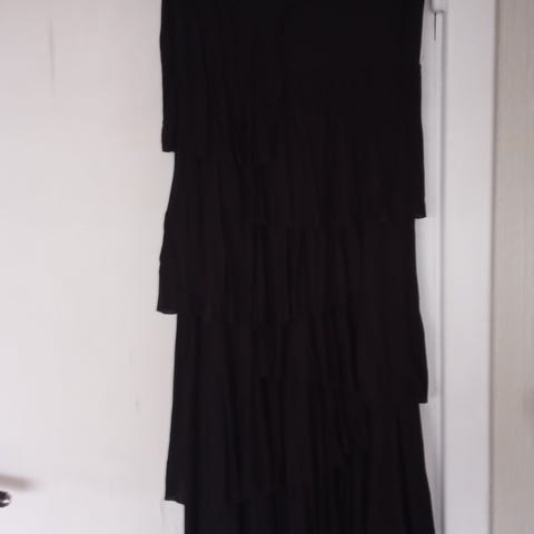 Juicy Couture sort strechy kjole med volanger I front (ikke bak) annenhver volange er med silke, resten er bomull. Aldri brukt.