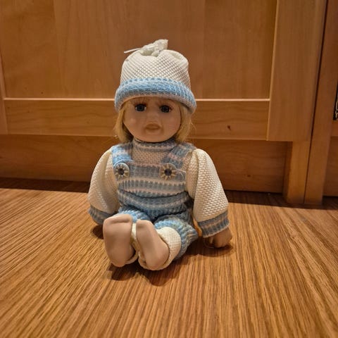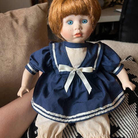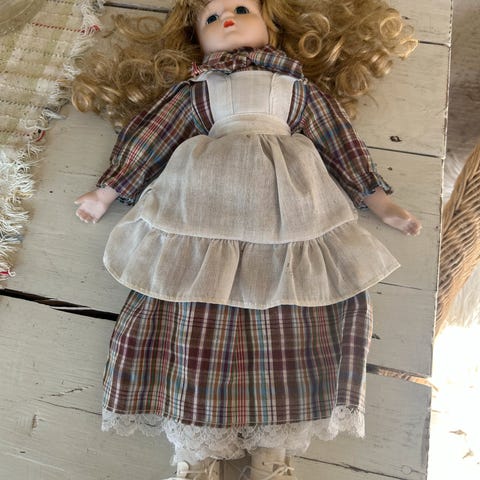 Porselensdukke i god stand. 9 cm lang.