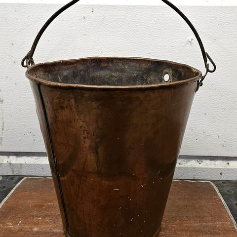 Retro is bøtte i kobber og messing med klype. Den har rist i bunnen.