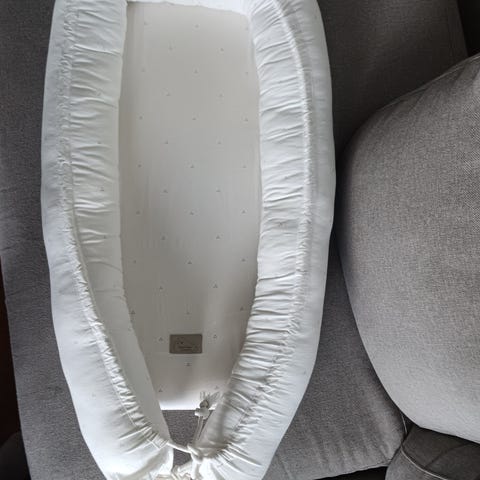 Vi selger et nydelig babynest fra camcam copenhagen. Trekket kan tas av og vaskes, og leveres nyvasket. Babynestet har gått bittelitt opp i sømmen nederst på venstre side, men dette er helt ubetydelig for bruken og heller ikke synlig☺️ Ellers helt og pent med masse bruk igjen🥰