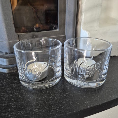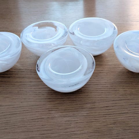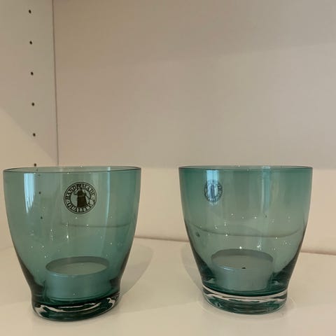 Nydelig sett, god vekt på de. tykt glass, men mønster i sort. Minner veldig om kosta boda og magnor sine verk. eneste som er merket er at det er handmade quality.