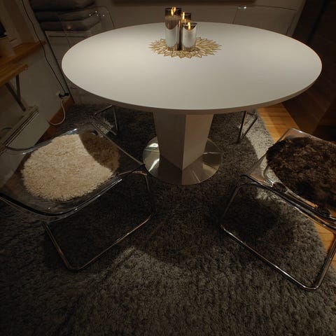 Nypris på en enkelt stol er kr. 1695 (se link). Det er noe slitemerker, men de er få og veldig lite synlig. Stolene er i meget god stand. Selges pga innkjøp av nytt spisebord og stoler.