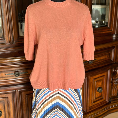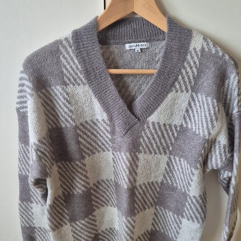 Jean Paul laksefarget genser modell Henny i str. M. 33%ull, 33% Mohair, 28 % Nylon, 6% elastan.