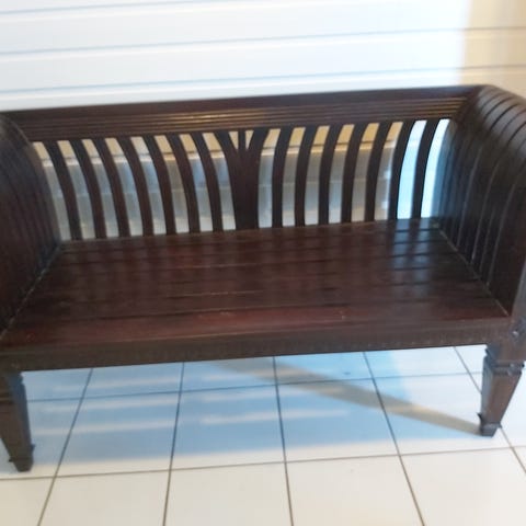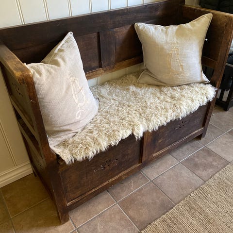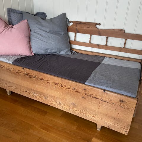 Slagbenk med oppbevaring, stoffet på sete er noe slitt. Mulig det er enkelt og fikse. Eg har bare hatt ett teppe over som dekket det.