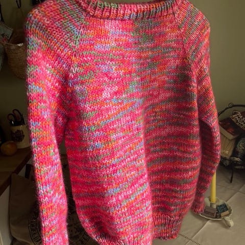 Nystrikket Fantasi genser str 8 - 10 år i ull og mohair . Overvidde 44 cm , lengde 56 cm og armlengde ca. 50 cm