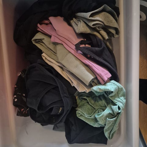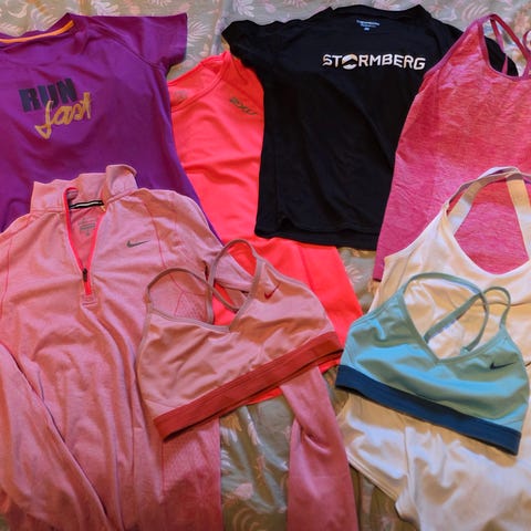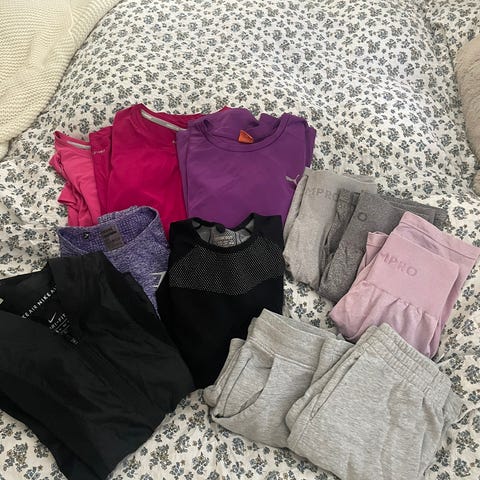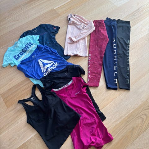Pakke med forskjellig treningsklær størrelse small. To sportsbher, to tskjorter i bomull, en T-skjorte i teknisk stoff og to treningstightser. Alle t-skjortene i dri-fit materiale.