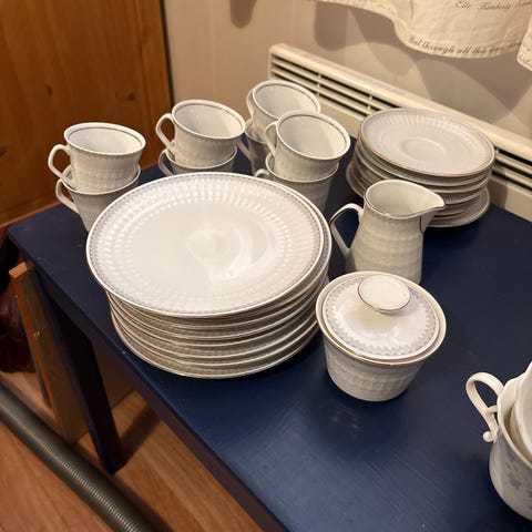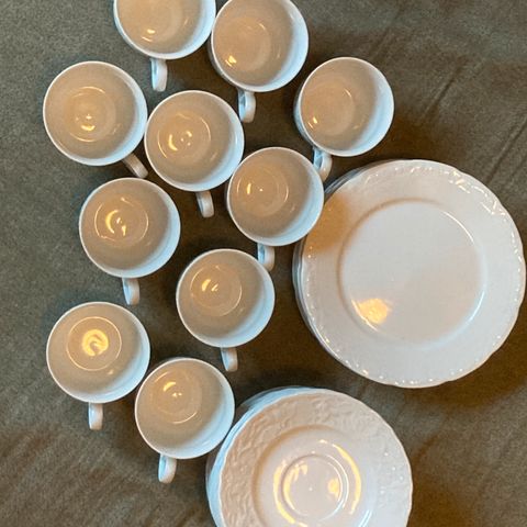 Komplett 9 set med to fløtemugger, to sukkerskål og tre ekstra store og små tallerkner.