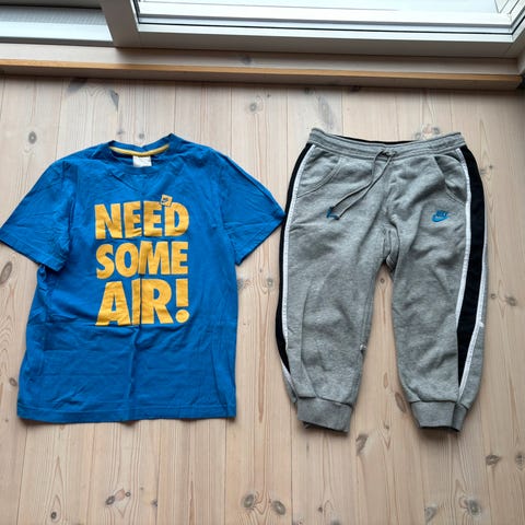Pakke med treningsklær fra Nike og Norheim størrelse medium. Sportsbher og treningsgenseren fra Nike er lite brukt. T-skjorten fra Norheim har noen nupper på ryggen (se bilde).