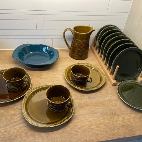 Det inkluderer: 2 kopper m.asjett, 2 tallerkner, 2 skåler, mugge, fløtemugge og sukkerkrukke.