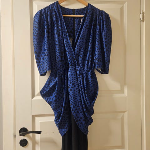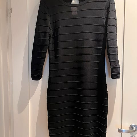 Sort kjole i fløyel / velur med lange gjennomsiktige ermer med tunge smykkemansjetter (rhinsten) selges for 250 kr.
