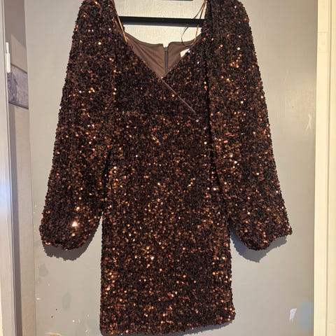 Den har V form på rygg, og gjennomsiktig med mønster rett ved hofte og over rygg. Kjempe fin kjole!